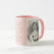 A Jane Austen mug with a list of her novels, also featuring an engraving of her and a regency fashion plate.