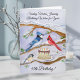 This hand-painted watercolor features a trio of favorite backyard birds a Blue Jay, Cardinal, and Black-Capped Chickadee gathered around a vanilla and chocolate birthday cake topped with glowing candles. It’s the perfect 45th birthday card for someone who loves nature, birds, and beautifully illustrated art.