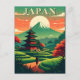 A stunning retro-style postcard of Japan featuring a traditional pagoda, lush green terraces, and the iconic Mount Fuji at sunset. Perfect for collectors, travelers, and lovers of Japanese culture.