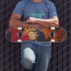 Japanese Anime Skateboard of a young samurai during a battle with a blazing temple.