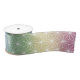 This ribbon uses a traditional Japanese pattern called Asanoha, which is a symbol of vitality. Asanoha designs are often used of products and clothing for kids and babies in the hope of promoting strong growth and health. This Asanoha design is on a background of pastel rainbow hues. Because the interesting geometric lines create the visual effect of sparkling stars, this ribbon is sure to please kids and adults and be suitable for both parties, sewing, gift wrapping, and crafts.