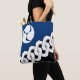 This happi coat-inspired tote bag features a traditional white chain pattern and three magatama "mitsudomoe" symbol in the corner. Customise the bag with a new background colour or text!