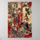Print shows an interior view of a brothel with several courtesans, three in front of a standing screen showing scene of a large bird perched on a pine branch. Japanese woodcut print from the Library of Congress collection.