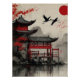 Japanese Crane Pagoda Red Sun Poster Zen Oriental