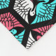 Fleece blanket in a classic Japanese kimono pattern of stylised cranes, arranged in a pattern of hexagons, in coral pink, turquoise, and white, on a black background