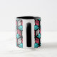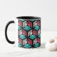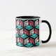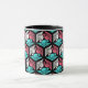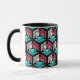 Mug in a classic Japanese kimono pattern of stylised cranes, arranged in a pattern of hexagons, in coral pink, turquoise, and white, on a black background