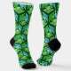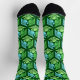 Socks in a classic Japanese kimono pattern of stylised cranes, arranged in a pattern of hexagons, in pale and medium jade green and light sky blue, on a dark jade green background
