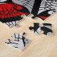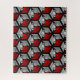 Puzzle in a classic Japanese kimono pattern of stylised cranes, arranged in a pattern of hexagons, in deep red, light and medium grey / grey, on a black background