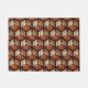 Doormat in a classic Japanese kimono pattern of stylised cranes, arranged in a pattern of hexagons, in tan, rust / terracotta, and cream, on a dark chocolate brown background