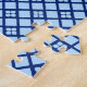 Puzzle in a classic Japanese fan in a traditional dragonfly, or tombo pattern, also called katsumushi (“winning bugs”) by samurai warriors, who used dragonfly motifs to invoke victory - light sky blue dragonflies on dark cobalt / navy blue, with a coordinating patterned background