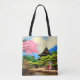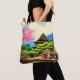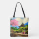 This tote bag has an illustration of a Japanese woman sitting in her garden with a house and mountain in the background.