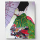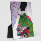 From an original watercolour painting by artist Sacha Grossel of a Japanese Geisha with a green decorated, fashionable kimono and black and red obi holding a purple umbrella decorated with flower blossoms. This Japanese and Kyoto inspired design is influenced by oriental and Asian art and by Japanese traditional fashion design.