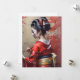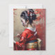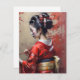 A woman dressed in a traditional Japanese kimono with red and floral patterns is depicted in profile view focusing on a task. The intricate hairstyle adorned with flowers and a wooden hairpin complements her elegant attire.