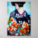 with original art design from watercolour painting of Japanese Geisha in dark blue intricate detailed orange kimono with sky blue background. Bright and colorful, inspired by oriental and Asian art, this beautiful lady comes from the Kyoto region of Japan.