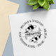 An elegant address stamp for a couple with a simple black and white vector illustration of a pair of Japanese koi fish circling each other. The family name is written across the illustration while the first names and the address are printed around it. Please note, you may need to adjust the information you enter by adding or deleting some characters or spaces, to make the name and the address properly aligned.