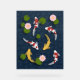 Beautiful minimalistic vector illustration of colourful Japanese koi fish swimming among the water lilies in a pond. Koi is a brightly coloured ornamental variety carp domesticated in Japan.