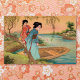 At a glance this image has the appearance of a woodblock print. Upon closer examination you will notice the graceful dot pattern of a stone chromolithograph of the Victorian period. The gentle colors and design illustrate a Japanese lakeside scene with two geishas and a boat. The willow trees and the apricot sky frame the colorful image. It is a delightful design for decor, personal correspondence and accessories.