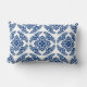 Lumbar pillow in a classic Japanese kimono pattern of stylised, four-way, medallions of leaves and flowers in deep cobalt blue on a white background
