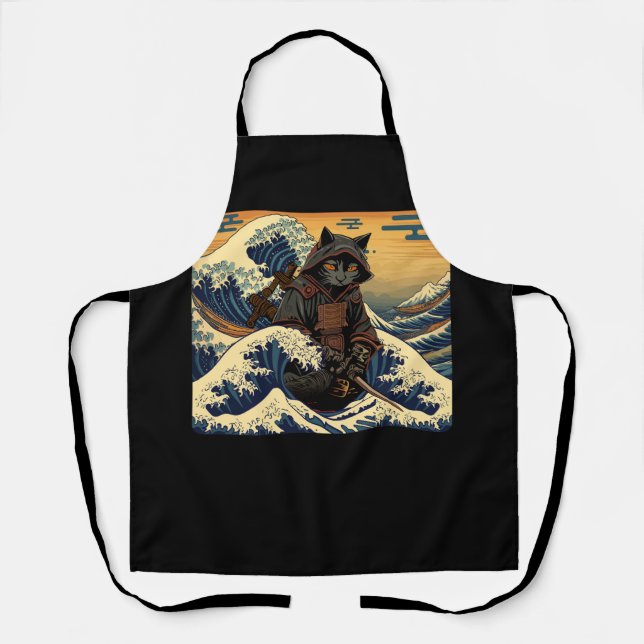 Japanese Retro Samurai Cat The Great Wave By Hokus Apron