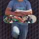 The skateboard features a design inspired by a Japanese Samurai warrior. This design features illustrations or graphs depicting a Samurai in a combat position, with details reflecting the traditional dress and distinctive armor of this historical figure of Japanese culture. Skateboarding not only serves as a means of transportation, but also becomes an artistic and cultural expression by incorporating visual elements related to Japan's rich Samurai heritage. This type of design attracts those who have an interest in Japanese history and aesthetics, offering a unique combination of functionality and style inspired by the warrior iconography of the samurai.