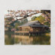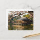 Japanese gardens are so beautiful! This postcard features a spring scene with a wooden hall built out over a tranquil pond. In the foreground, a branch laden with cherry blossom frames the scene.