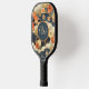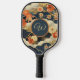 This retro look pickleball paddle features a Japanese style print -- similar to patterns from kimonos -- with white, teal, tan, and orange on dark teal-- almost black. Your monogram initial appears in gold text on a coordinated color block of dark blue teal, bordered by orange. This paddle a great gift for the pickleball dink queen or king on your list.