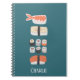 Celebrate your love for sushi with this personalised notebook featuring a fun medley of hand-illustrated Japanese sushi icons on a stylish teal green background. From maki to nigiri, the playful food motifs add a touch of joy to your writing or journalling. Perfect for students, sushi fans, or anyone who appreciates clever design and Japanese pop culture aesthetics. Change the name to personalise. Original art by Nic Squirrell.