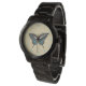 The wings and body of a swallowtail butterfly are decorated with designs inspired by patterns on kimonos and haoris from Japan, with traditional motifs like seigaiha or waves, kikko or geometric tortoiseshells decorated with flowers, and yagasuri or arrow fletching. These patterns use colours found in these clothes such as gold, green, bright purple, turquoise blue, white, and black. The antennae take inspiration from the brush strokes of Japanese sumi-e artwork and kanji. This watch is available in a variety of sizes, colours, and styles, including sizes for both kids and adults.