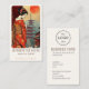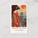 Business card featuring a beautiful elegant maiko / geisha, pagoda temples, and a big red sun - all old symbols of Japan.
