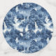 Serene Japanese water garden rendered in a blue and white porcelain effect. The scene features cascading waterfalls flowing over large, smooth rocks surrounded by lush trees and bushes. A prominent arched bridge spans a tranquil pond, reflecting the surrounding landscape. The overall colour scheme is a gradient of blue hues, creating a peaceful and harmonious atmosphere reminiscent of traditional porcelain artwork. The detailed depiction of natural elements like water, rocks, and vegetation highlights the tranquil beauty and intricate design typical of a Japanese garden.