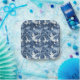 Serene Japanese water garden rendered in a blue and white porcelain effect. The scene features cascading waterfalls flowing over large, smooth rocks surrounded by lush trees and bushes. A prominent arched bridge spans a tranquil pond, reflecting the surrounding landscape. The overall colour scheme is a gradient of blue hues, creating a peaceful and harmonious atmosphere reminiscent of traditional porcelain artwork. The detailed depiction of natural elements like water, rocks, and vegetation highlights the tranquil beauty and intricate design typical of a Japanese garden.
