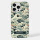 Make a statement with this iphone 15 pro max phone case that features rolling Japanese waves in multiple shades of teal blue and splashes of earth tones. It's modern yet traditional. The pattern represents surges of good luck, peace, and eternal resilience. It becomes uniquely yours with your name in a CAP font in white on dark teal.