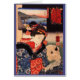 Vintage illustration of a Japanese woman in kimono with her cat reading the newspaper.