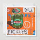 Art print of a jar of pickles with orange background and text.