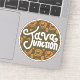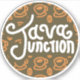 A Java Junction themed button in coffee brown with a classy coffee themed pattern.