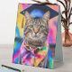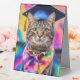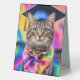 Vibrant Table Tent Sign with whimsical artwork. This charming tabby wearing a blue grad cap and a tie dye scarf behind a pscychedelic background .