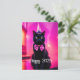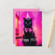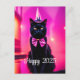 Festive New Year's postcard featuring vibrant fantasy artwork. A stylish black cat with a pointed hat and purple bow tie is sporting a jazzy look, and it comes with the text " Happy 2024 "