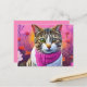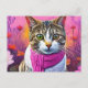 A vibrant spring postcard   with whimsical artwork. This charming tabby is wearing a magenta scarf, posing outdoors in a meadow with wild flowers in the background.Embracing a jazzy vibe .