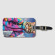 This luggage tag features fantasy art. A jazzy kitty in a trippy-coloured outfit is on a ski tour. Add your monogram right now.