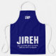 Simple modern blue and white Christian apron with deep pink typography that reads JEHOVAH JIREH, which is based on the Bible verse from Genesis 22:14. The 'Jehovah' is placed vertically within the J of 'Jireh'. At the top there is placeholder monogram. At the bottom is a popular Czech proverb - 'The God who gave us teeth will also give us bread.' This text is CUSTOMIZABLE so you can personalise with your name or wording of your choice (or delete). Other colours available.