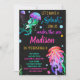 This brightfull and colorfull invitation has aqua background, red and purple jellyfish and some bubbles.