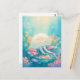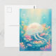 This heartwarming design features an incredibly sweet and round white jellyfish shown swimming joyfully through a vibrant underwater paradise. The jellyfish has a translucent white bell adorned with a delicate pink floral shape on its crown, featuring a blissfully happy face with closed eyes and a small smile. Its long, frilly white tentacles flow gracefully through the crystal-clear turquoise and light blue water. The character is surrounded by shimmering bubbles and a lush garden of hand-painted pink, orange, and yellow coral reefs at the bottom of the frame. Beams of bright golden sunlight filter down from the surface, illuminating the scene and creating a cheerful, magical atmosphere filled with soft light particles. The overall aesthetic is bright, cozy, and full of wonder, making it an irresistible choice for fans of marine life and playful ocean art. This cheerful jellyfish postcard is a wonderful choice for sending a warm "thinking of you" note or a sun-drenched greeting to a friend who finds joy in the colorful magic of the sea. You might choose to use this artistic card for an under-the-sea themed birthday invitation or as a sweet way to share news of a summer beach trip with your family. It also makes a precious decorative piece for a child's nursery wall or a bright addition to a creative scrapbooking project as a small token of aquatic happiness. This versatile design is also an excellent choice for a holiday thank you note, a graduation message, or as a heartwarming way to share a message of joy for any situation or event.