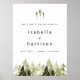 This wedding welcome sign features rustic watercolor pines and a bohemian handwritten font.