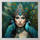 Jennabeth is a fantasy portrait of a beautiful woman with two peacocks sitting on her shoulders. Her headpiece is made of gorgeous peacock feathers and turquoise jewels encased in gold. She is wearing a fantastic choker that is embellished with turquoise jewels that match the jewels in the headpiece. The metalwork in the choker is elaborate and made by a skilled artisan. She is wearing a gown with a peacock pattern silk. Jennabeth is gorgeous with blue eyes highlighted with turquoise and brown. A beautiful fantasy portrait.