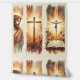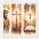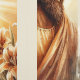 Religious Art Wallpaper depicting three scenes related to religious themes. On the left, a portrait of Jesus Christ, light-skinned, middle-aged, with a crown of thorns, looking slightly to his left; he's positioned in the left-third section of the image. In the middle, a cross is depicted against a backdrop of a sunlit landscape, and a golden-toned glow is apparent behind the cross. In the right section, Jesus is depicted on a cross against a background of flowers and a golden glow. The image is framed within a eggshell background, with gold accents. Watercolor-style brushstrokes and highlights enhance the artistic feel of the scenes. The Religious Art Wallpaper suggests a serene and devout atmosphere. The style is religious art, possibly inspired by religious iconography or paintings. The composition is vertically orientated, with the scenes arranged in a tripartite format within the Religious Art Wallpaper frame, suggesting the themes are connected. The colours are warm earth tones, with accents of gold and eggshell