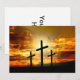 Jesus Christ and Blessed Virgin Mary with dove overlooking the crosses on Calvary hill at sunset. http://frontiernow.com Please add your own text.