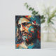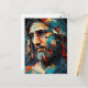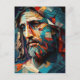 Cette carte est ornée de l'image de Jésus Christ. Elle est représentée par des formes géométriques complexes et des couleurs vives, avec des parties du corps décomposées et représentées sous différents angles. Cela crée une impression de mouvement et de profondeur, tout en ajoutant une touche artistique unique.