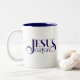 Coffee mug is shown in navy and white with a Jesus is the way print.