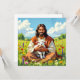 Christian religious notecard with an ai illustration of Jesus Christ holding a lamb and smiling.