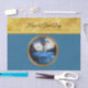 Jesus in the centre of a valley with a wooded cross above him in the clouds with a chain around the cross. You can see Jesus in the rippling water. With a gold frame and a gold foil texture design with a blue back ground.